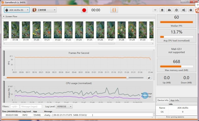 为了测试荣耀Play3的性能,我们利用gamebench来测试了一下荣耀Play3在王者荣耀与和平精英中的帧率情况。