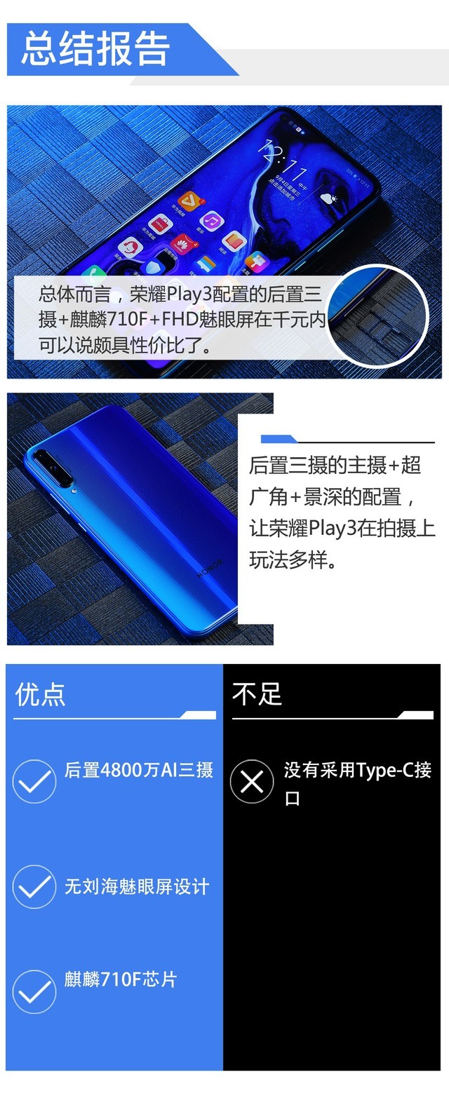 总的来说,荣耀Play3非常对得起性价比一词,拥有4800万AI三摄,以及准旗舰级麒麟710F芯片的它,在拍照和性能上在同等价位的手机中表现都非常突出。而且荣耀Play3外观也是不俗,拿在手中光华流转,加上正面魅眼屏的超高屏占比,可以说荣耀Play3颜值与实力并存。