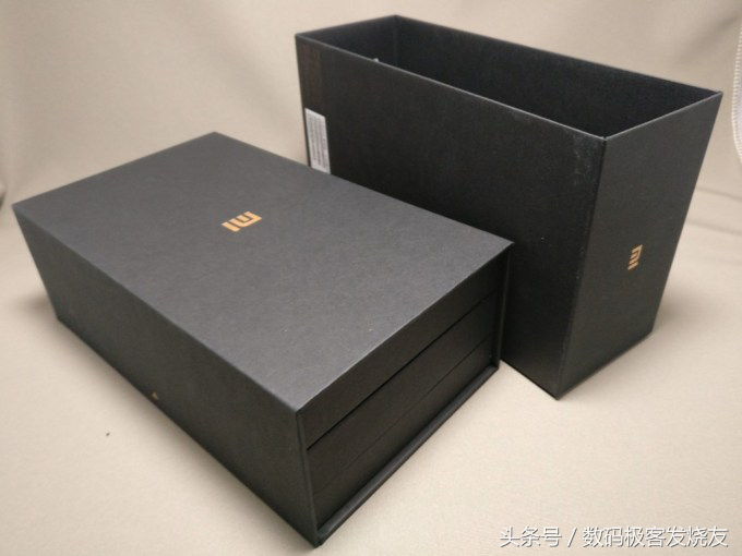 小米的包装还是比较大气沉稳,抽出最外层之后,首先映入眼帘是金色的MI字logo,高级感油然而生。内部采用风琴式包装,也算是别出心裁,第一层为小米MIX真机,第二层是赠送的手机保护壳,第三层为手机配件及说明书。