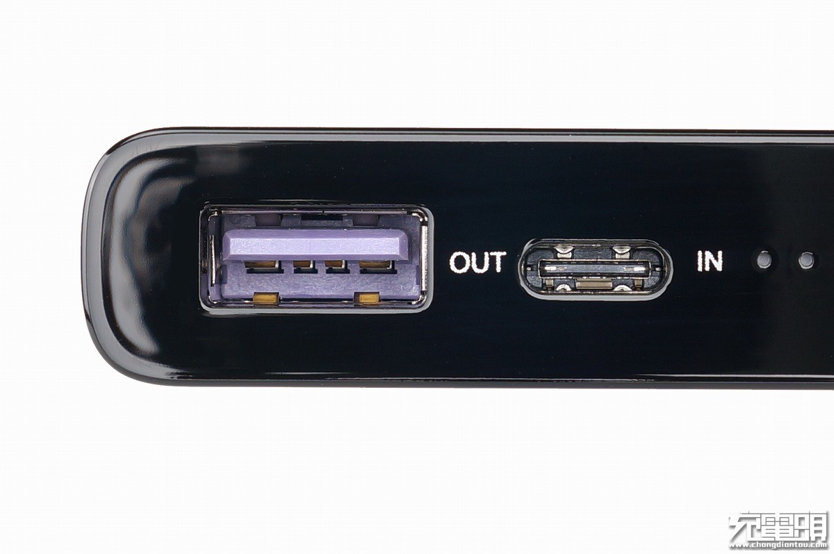 AP09S头部与壳体是两种不同结构组成,喷砂阳极铝合金身体上亮面印出10字样代表10000mAh、钢琴漆效果的塑胶材质头部。面板上从左到右分别是紫色舌片的USB Type-A常规输出插孔,USB Type-C 输入插孔、4LED电量显示、激活按钮。
